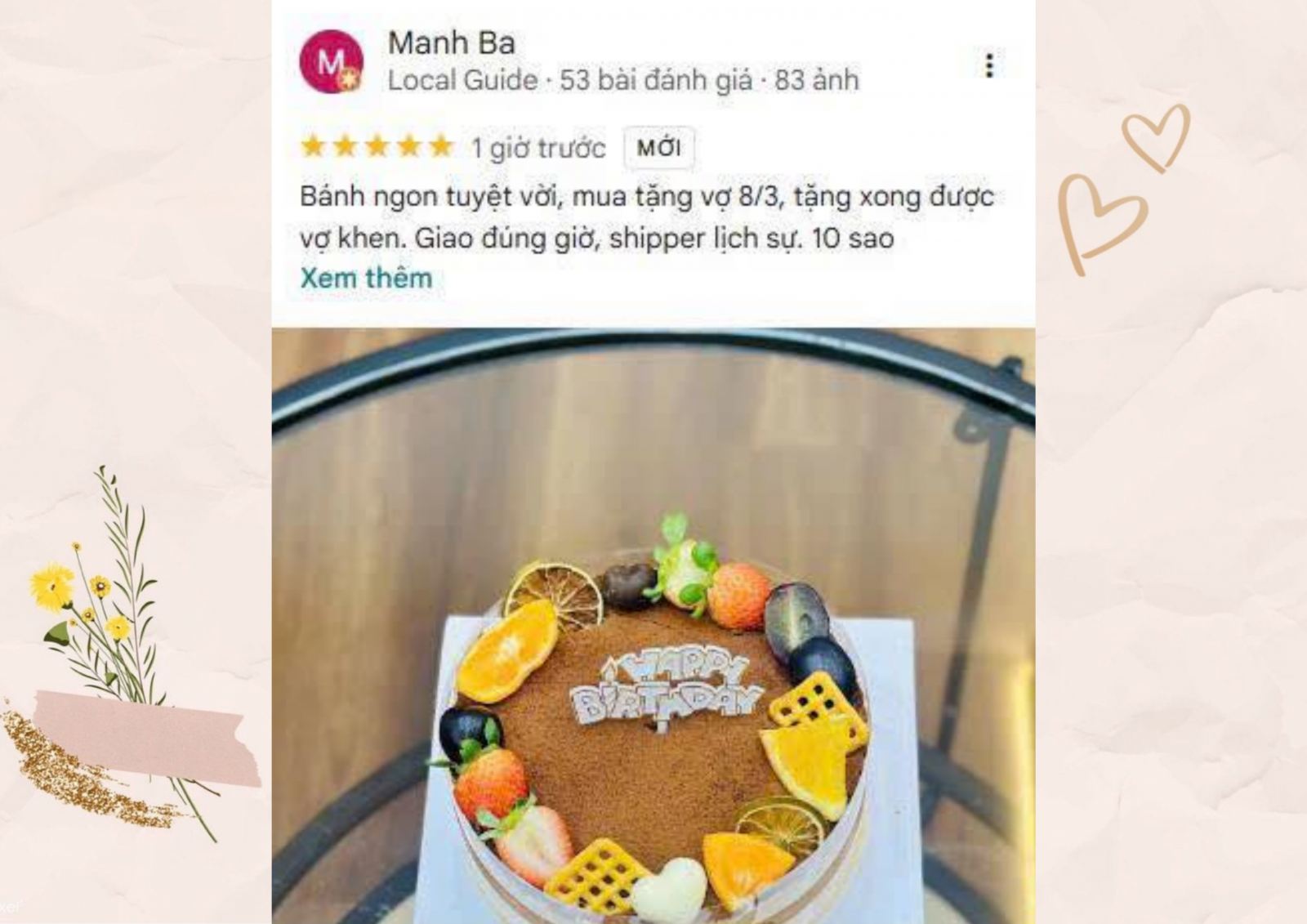 Anh Manh Ba, một Local Guide tâm huyết đã chấm 10 sao cho Củi: "Bánh ngon tuyệt vời, mua tặng vợ 8/3, tặng xong được vợ khen. Giao đúng giờ, shipper lịch sự".