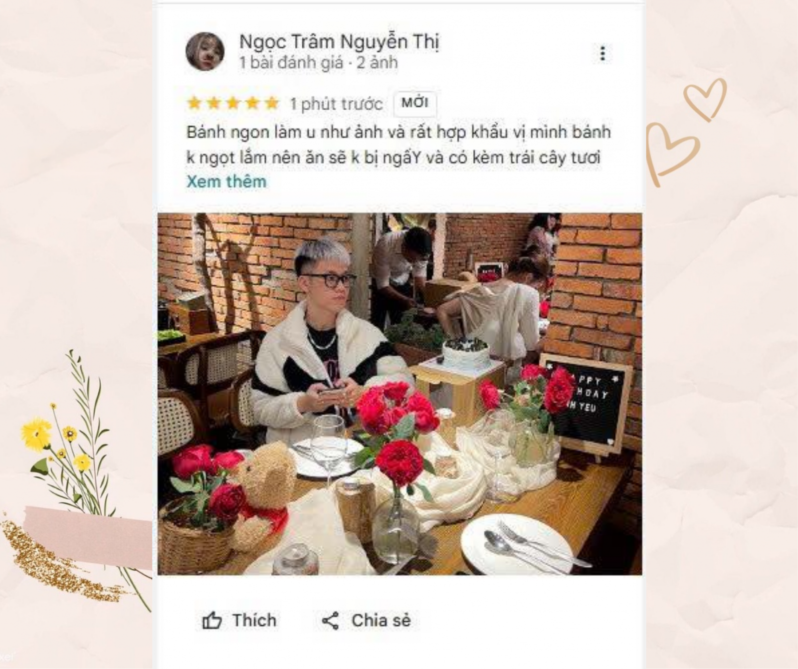 Chị Ngọc Trâm Nguyễn Thị đã chia sẻ sau một buổi tiệc sinh nhật ấm cúng: "Bánh ngon làm u như ảnh và rất hợp khẩu vị mình, bánh không ngọt lắm nên ăn sẽ không bị ngấy và có kèm trái cây tươi".