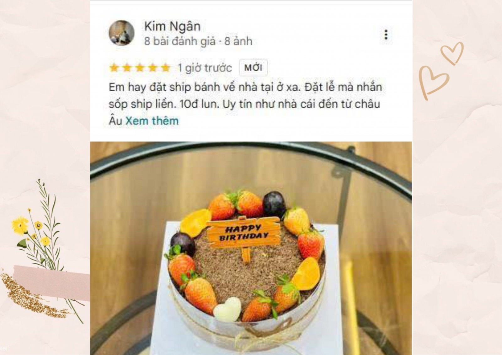 Một đánh giá hóm hỉnh nhưng đầy sức nặng từ bạn Kim Ngân: "Em hay đặt ship bánh về nhà tại ở xa. Đặt lễ mà nhắn sộp ship liền. 10đ luôn. Uy tín như nhà cái đến từ châu Âu".