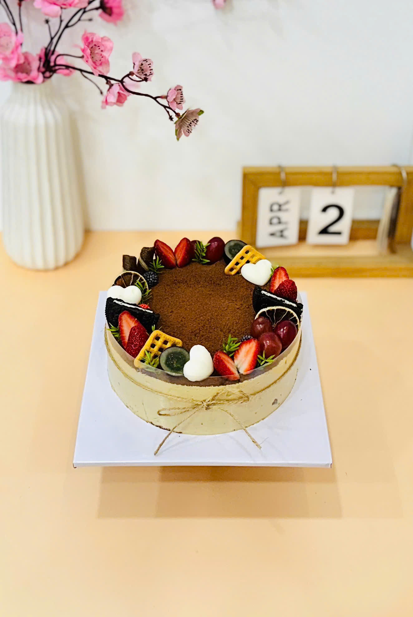 Với lớp bột cacao nguyên chất phủ mặt kết hợp cùng dâu tây, nho đen và cam tươi, đây là mẫu bánh xuất hiện dày đặc trong các feedback tuần này. Sự hòa quyện giữa vị đắng nhẹ của socola và vị chua thanh của trái cây tạo nên một trải nghiệm khó quên.